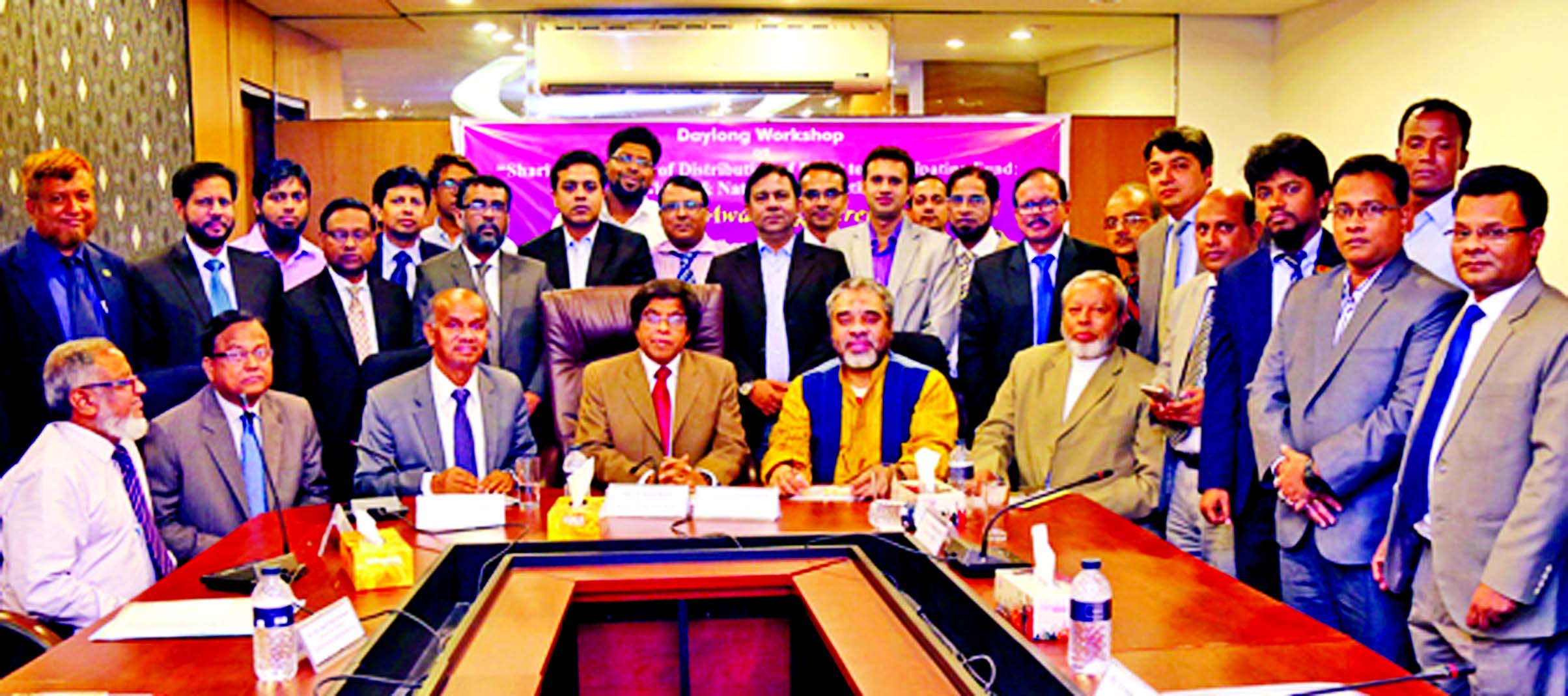 Arastoo Khan, Chairman of Islamic Banks Consultative Forum and Islami Bank Bangladesh Limited, poses with the participants of a day-long workshop on \"Shariah Principles of Distribution of Profit to Participating Fund: Global & National perspective\" at B