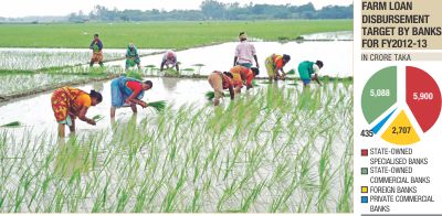 The central bank has set the farm loan disbursement target for all the 47 banks operating in Bangladesh at Tk 14,130 crore for fiscal 2012-13, up by only 2.39 percent from the previous year.