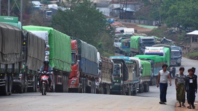 Transactions in Muse are becoming difficult as Chinese banks have frozen over 1,000 bank accounts with estimated deposits of Ks40 billion (US$29.42 million) belonging to Burmese traders on Wednesday, June 14, 2017. In the photo, trucks at Muse 105-mile trade camp in Shan State of Myanmar