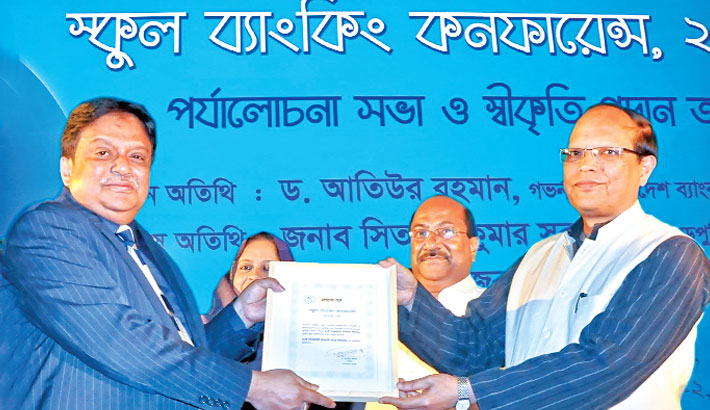 Dr. Atiur Rahman, Governor, Bangladesh Bank, hands over an award to Abdul Aziz, Deputy Managing Director of First Security Islami Bank Limited (FSIBL) in Sylhet on Saturday, for contribution of FSIBL on financial service awareness campaign including school banking among students and general public in the School Banking Conference. BB Deputy Governor SK Sur Chowdhury was also present.