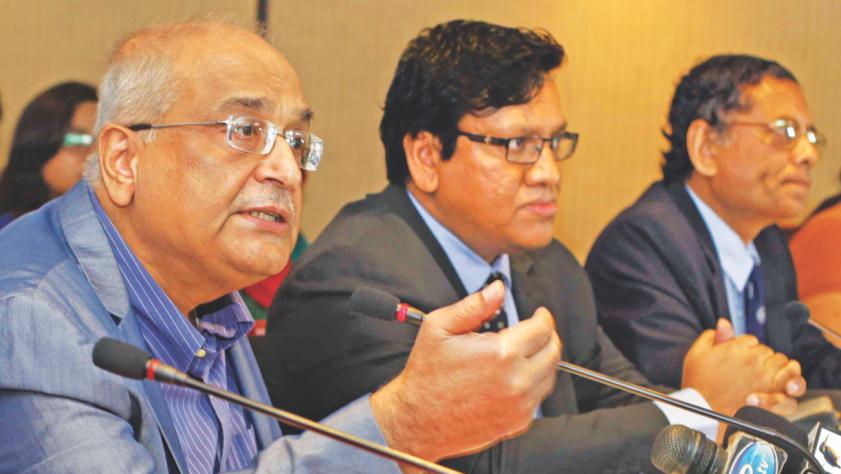From left, Debapriya Bhattacharya, distinguished fellow of Centre for Policy Dialogue; Towfiqul Islam Khan, research fellow; and Mustafizur Rahman, executive director, attend a media briefing on the think tank's recommendations for the upcoming budget, held at Brac Centre Inn in Dhaka yesterday.