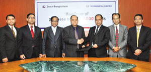 Managing Director of DBBL K.S Tabrez and Managing Director of Technomedia Limited Joshoda Jibon Deb Nath exchanging documents in the signing ceremony of the agreement under which Technomedia Limited will supply 1100 NCR ATMs. Deputy Managing Director of DBBL Abul Kashem Md. Shirin and COO of Technomedia Khorshed Alam also attended the programme held Monday.