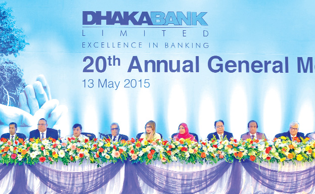 Dhaka Bank Limited declared 14 percent cash and 10 percent stock dividends for the bank’s shareholders for the year ended on December 31, 2014. The declaration came at the bank’s 20th Annual General Meeting (AGM) held at Bashundhara Convention Center 2 in Dhaka on Wednesday, said a press release. Abdul Hai Sarker, Chairman of the bank, presided over the meeting. Afroza Abbas, former vice-chairperson and Sponsor Shareholder, Reshadur Rahman, former chairman and Director, ATM Hayatuzzaman Khan, former chairman, Altaf Hossain Sarker, Mohammed Hanif, Md Amirullah, Abdullah Al Ahsan, Tahidul Hossain Chowdhury, Jashim Uddin, Khondoker Jamil Uddin, and Amanullah Sarker, Directors, Suez Islam and Syed Abu Naser Bukhtear Ahmed, Independent Directors, Aminul Islam, Khandaker Mohammad Shahjahan, Rakhi Das Gupta, former directors, and Niaz Habib, Managing Director of the bank, attended the meeting. Emranul Huq, Khan Shahadat Hossain, Shakir Amin Chowdhury, Deputy Managing Directors, Arham Masudul Huq, Company Secretary, and a good number of shareholders of the bank were present on the occasion.