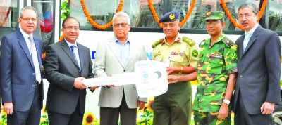 Abdul Hai Sarker, Chairman, Dhaka Bank Ltd, hands over the key of a bus to Brigadier General Md Sharafat Hossain, Director, Personnel Services and Provost Marshal at the Proyash School premises on Wednesday.