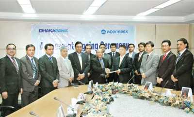 Khondker Fazle Rashid, managing director of Dhaka Bank and Tanweer Rahim, deputy managing director, Eung Joon Kim, country manager and general manager for Woori Bank Dhaka branch, signed the agreement on behalf of their respective organizations, said a press release.