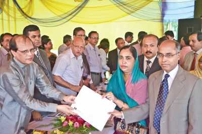 Dr. Atiur Rahman, Governor of Bangladesh Bank, is handing over a document on sanction advice to Sultana Rajia, Proprietress of Rajia Enterprise, a client of Cox’s Bazar branch of Southeast Bank Limited at “Bank-NASCIB SME Saikat Utsab – 2011”, in Cox’s Bazar recently.