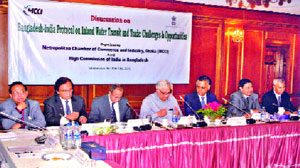 Dr. Mashiur Rahman, economic affairs advisor to the prime minister, speaks at a discussion on "Bangladesh-India Protocol on Inland Water Transit and Trade: Challenges & Opportunities," jointly organised by the Metropolitan Chamber of Commerce and Industry, Dhaka (MCCI) and High Commission of India in Bangladesh, held Wednesday in the city. Indian high commissioner Pankaj Saran and MCCI president Syed Nasim Manzur, among others, attend the discussion.