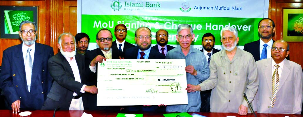 Engr. Mustafa Anwar, Chairman of Islami Bank Bangladesh Ltd. handing over the cheque to Md. Shamsul Huque Chishty, President of Anjuman-e Mufidul Islam at Islami Bank Tower in the city on Thursday.