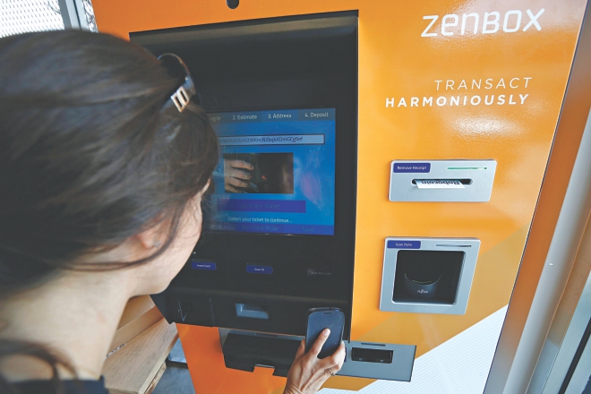 A woman buys bitcoins at one of Southern California's first two bitcoin-to-cash ATMs in Venice, California.