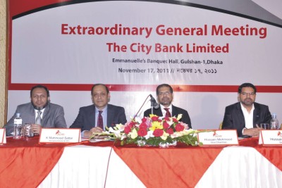 Hossain Mehmood, vice chairman of City Bank, presides over an extraordinary general meeting of the Bank at Emmanuelle's Banquet Hall in Dhaka recently.