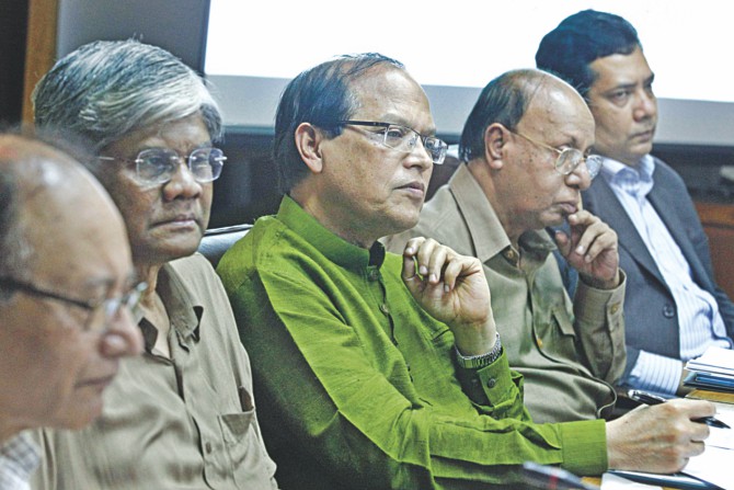 From left, Mustafa K Mujeri, director general of BIDS; Salehuddin Ahmed, a former central bank governor; Atiur Rahman, governor of Bangladesh Bank; AB Mirza Azizul Islam, former caretaker government adviser; and Monzur Hossain, senior research fellow of BIDS, attend a seminar on monetary policy in Dhaka yesterday.