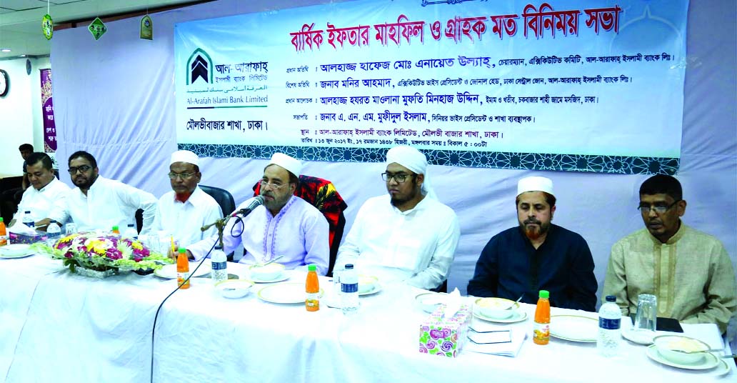 Hafez Md. Enayet Ullah, Chairman of Board Executive Committee of Al-Arafah Islami Bank Limited, addressing the Iftar Mahfil and Clients Exchange of Views programme at Moulvibazar Branch in Dhaka recently.