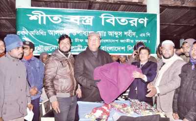Vice Principal Abdus Shahid, Chief Whip of the parliament, hands over blankets among the cold-hit people at Sreemangal organised by Islami Bank Bangladesh Limited.