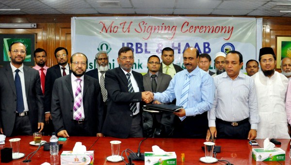 Dhaka : Islami Bank Bangladesh Limited and Hajj Agencies Association of Bangladesh (HAAB) sign a Memorandum of Understanding (MoU) at Islami Bank Tower on April 20, 2014. In presence of Mohammad Abdul Mannan, Managing Director of the Bank, the agreement was signed by Mohd. Shamsul Haque, Deputy Managing Director of Isalmi Bank and Md. Ebrahim Bahar, President HAAB on behalf of their respective sides. A.K.M. Abdul Malek Chowdhury, Md. Mahbub-ul-Alam, Rafi Ahmed Begh, Nurul Islam Khalifa, Deputy Managing Directors of the Bank along with high officials and executives of the both organizations were present on the occasion.