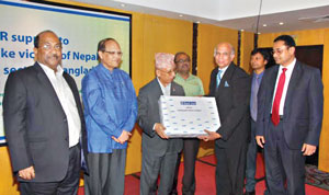 In presence of Bangladesh Bank Governor Dr. Atiur Rahman, Managing Director (CC) of Bank Asia Aminul Islam is handing over a token of Bank Asia's contribution for the devastating earthquake victims of Nepal to the country's Ambassador to Bangladesh H.K. Shrestha at a function held at a hotel in Gulshan in the city Monday. (more related picture on page 16)