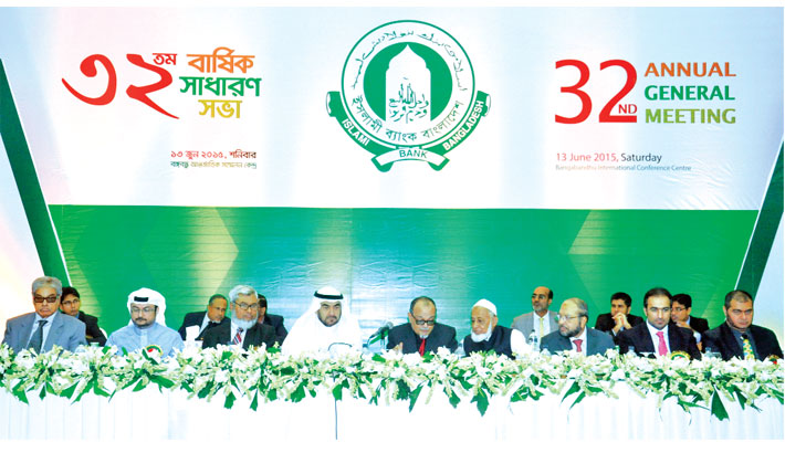 Engr. Mustafa Anwar, Chairman (acting) of Islami Bank Bangladesh Limited, presides over the 32nd AGM of the bank held at the Bangabandhu International Conference Centre in Dhaka on Saturday.