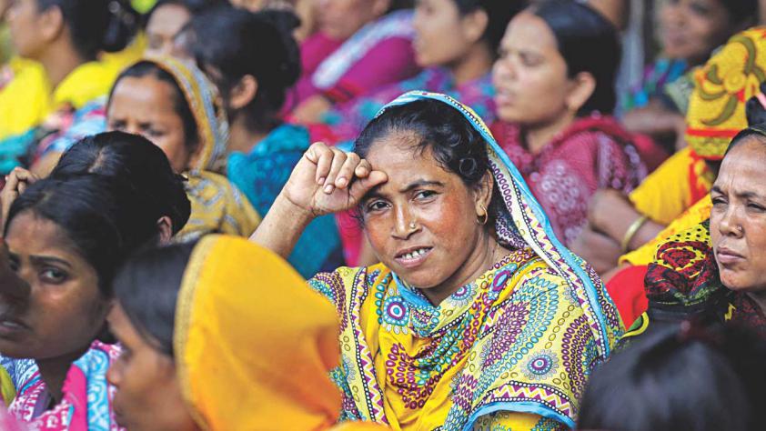 Employees of Swan Garments gather outside the National Press Club in Dhaka yesterday during a demonstration for immediate payment of their wages accumulated since the factory closed in April.