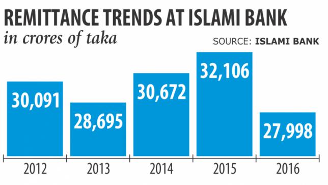 Remittance receipts of Islami Bank Bangladesh fell 13 percent in 2016 compared to the previous year.