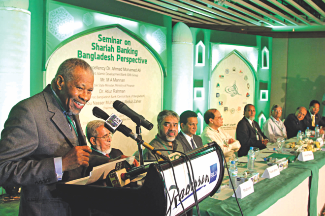 Ahmad Mohamed Ali, president of Islamic Development Bank, speaks at a seminar on shariah banking at Radisson Hotel in Dhaka yesterday. Atiur Rahman, governor of Bangladesh Bank, was also present.