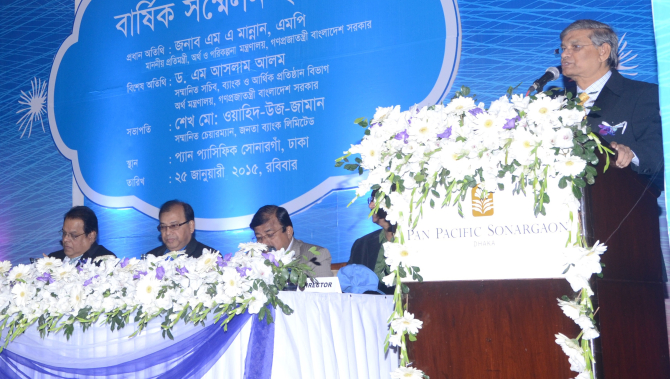 MA Mannan, state minister for finance; Shaikh Md Wahid-uz-Zaman, chairman of Janata Bank, and Md Abdus Salam, managing director, attend the annual meeting of the bank at Sonargaon Hotel in Dhaka yesterday.