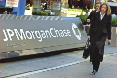 Pedestrians walk past the JP Morgan Chase headquarters in New York.