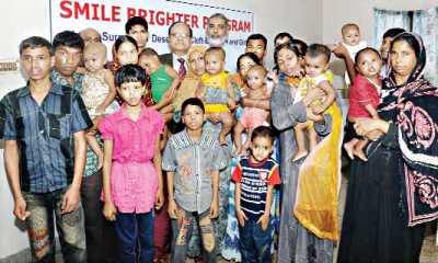 KS Tabrez, Managing Director of Dutch-Bangla Bank, seen with the cleft-lipped girls and boys at a plastic surgery camp of DBBL at South View Hospital at Mirpur Sunday.