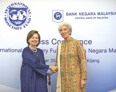 International Monetary Fund Managing Director Christine Lagarde (R) shakes hand with Malaysian Central Bank Governor Zeti Akhtar Aziz in Kuala Lumpur yesterday.