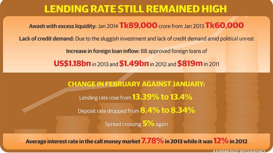 Lending rate of all the commercial banks still remained high despite awash with excess liquidity, lack of credit demand and increase in foreign loan inflow since last one year ahead of national election, bankers said.