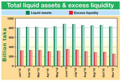 The excess liquid assets of state owned banks as on end November 2010 totaled Tk 94.62 billion, private commercial banks Tk 85.19 billion, private Islamic banks Tk 28.85 billion, foreign banks Tk 37.63 billion, specialised banks Tk 1.27 billion.