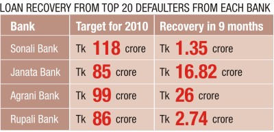 Bangladesh Bank data shows only 12 percent achievement of the Tk 388 crore bad debt recovery target from top 20 defaulters in 2010. During January-September, state-commercial banks could recover Tk 47crore.
