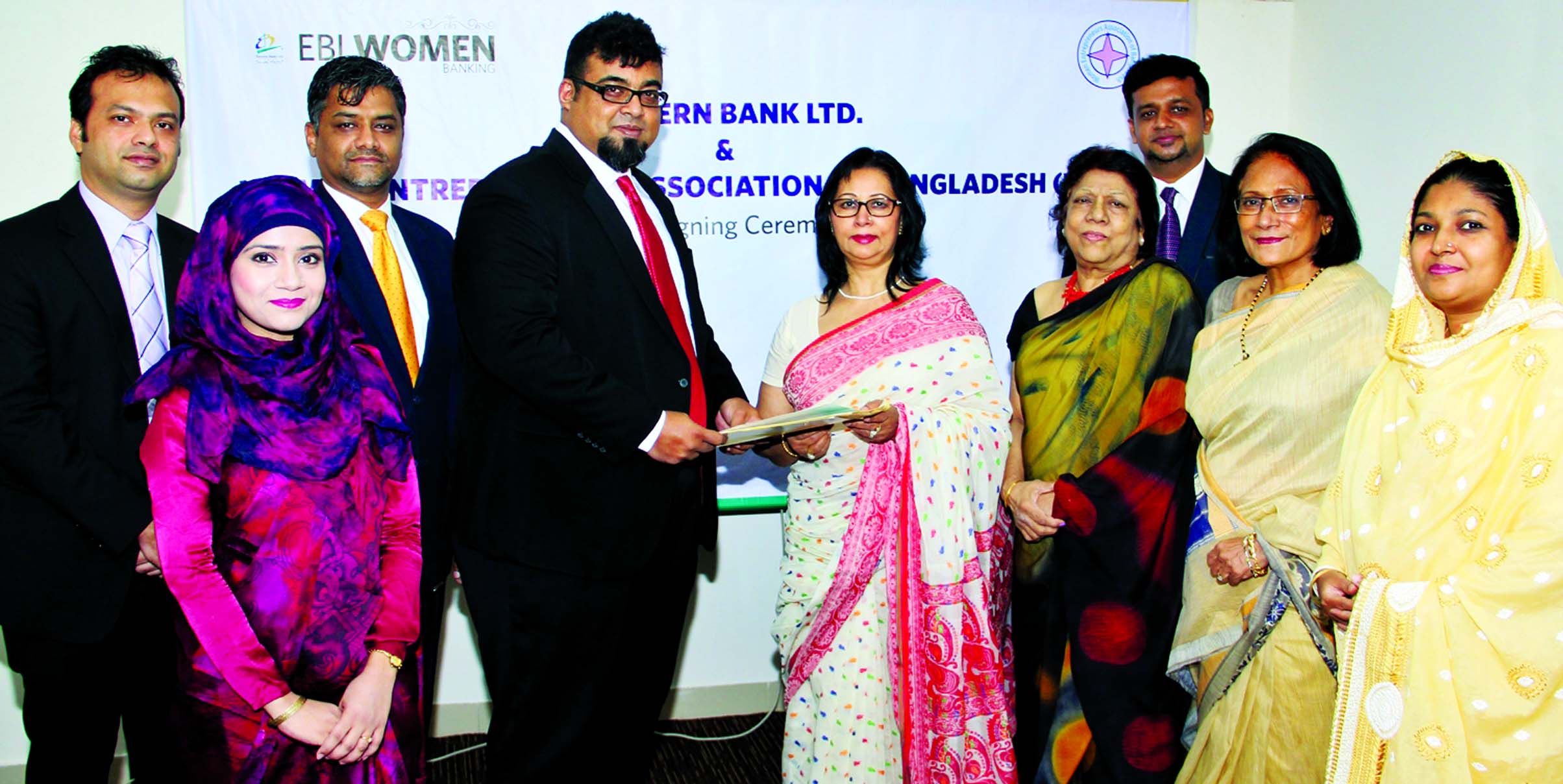 M Nazeem A Choudhury, Head of Consumer Banking of Eastern Bank Limited (EBL) and Nasreen Fatema Awal, President of Women Entrepreneurs Association of Bangladesh (WEAB) exchanging an agreement signing documents at the bank head office in the city recently.