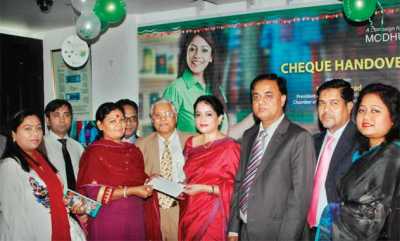 Selima Ahmed, eminent women entrepreneur, hands over a cheque to a woman entrepreneur at a function organised by Madhumoti Bank Limited in Dhaka recently. Md. Mizanur Rahman, Managing Director and CEO of the bank, is also seen.