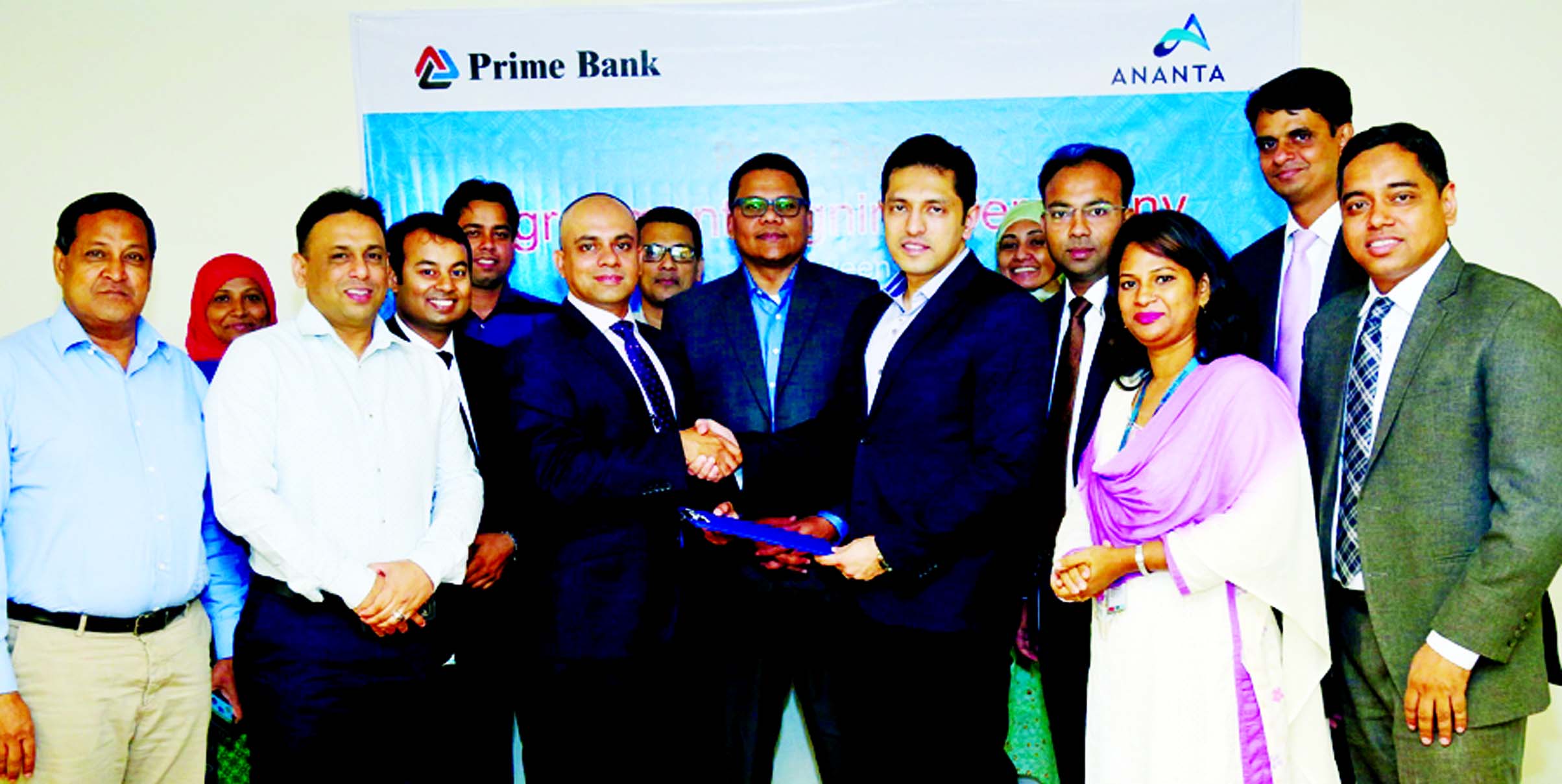 Mamur Ahmed, SVP, Consumer Banking Division of Prime Bank Limited and Sharif Zahir, Managing Director of Ananta Group, ink "Prime Payroll" agreement recently. Rahel Ahmed, Deputy Managing Director of the bank was present.