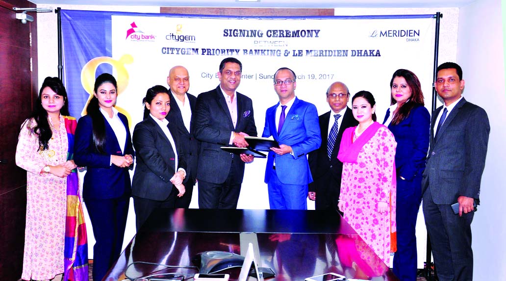Mashrur Arefin, Additional Managing Director of City Bank and Ashwani Nayar, General Manager of Le Méridien Dhaka signed an agreement for discount up to 50 percent on different service at the hotel in the city recently. Farhia Haque, Head of Citygem Prior