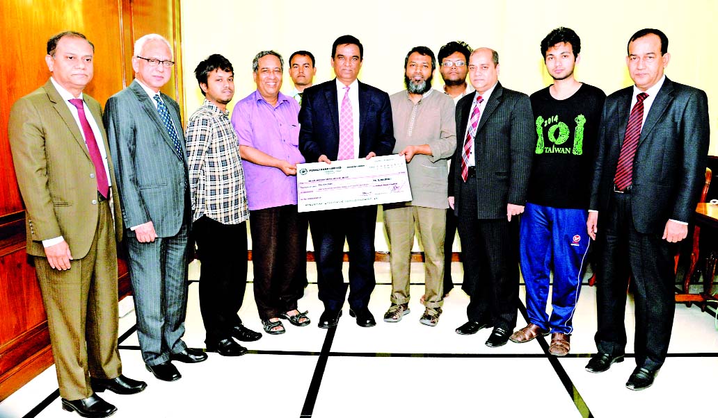 Md Abdul Halim Chowdhury, Managing Director of Pubali Bank Ltd, handing over a Tk 5.00 lakh cheque to Professor Dr. M. Sohel Rahman, Head of CSE Dept, BUET as part of Corporate Social Responsibility recently. Professor Dr. M. Kaykobad, Dean, Faculty of
