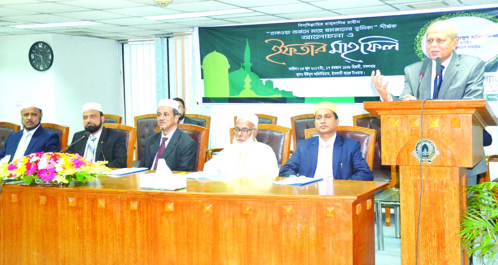 Md. Abdul Hamid Miah, Managing Director of Islami Bank Bangladesh Limited, addressing a discussion on 'Role of Ramzan in Attaining Taqwa' and Iftar Mahfil at the bank's head office in the city on Tuesday. Dr. Hasan Mohd. Moinuddin, Member of Shari`ah Supe