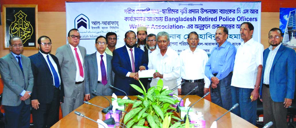 Md Habibur Rahman, Managing Director of Al-Arafah Islami Bank Limited, handed over a cheque of Tk. 5 lakh for giving scholarships to poor and meritorious students to M Shahidul Islam Chowdhury, former Inspector General of Police and President of Banglades