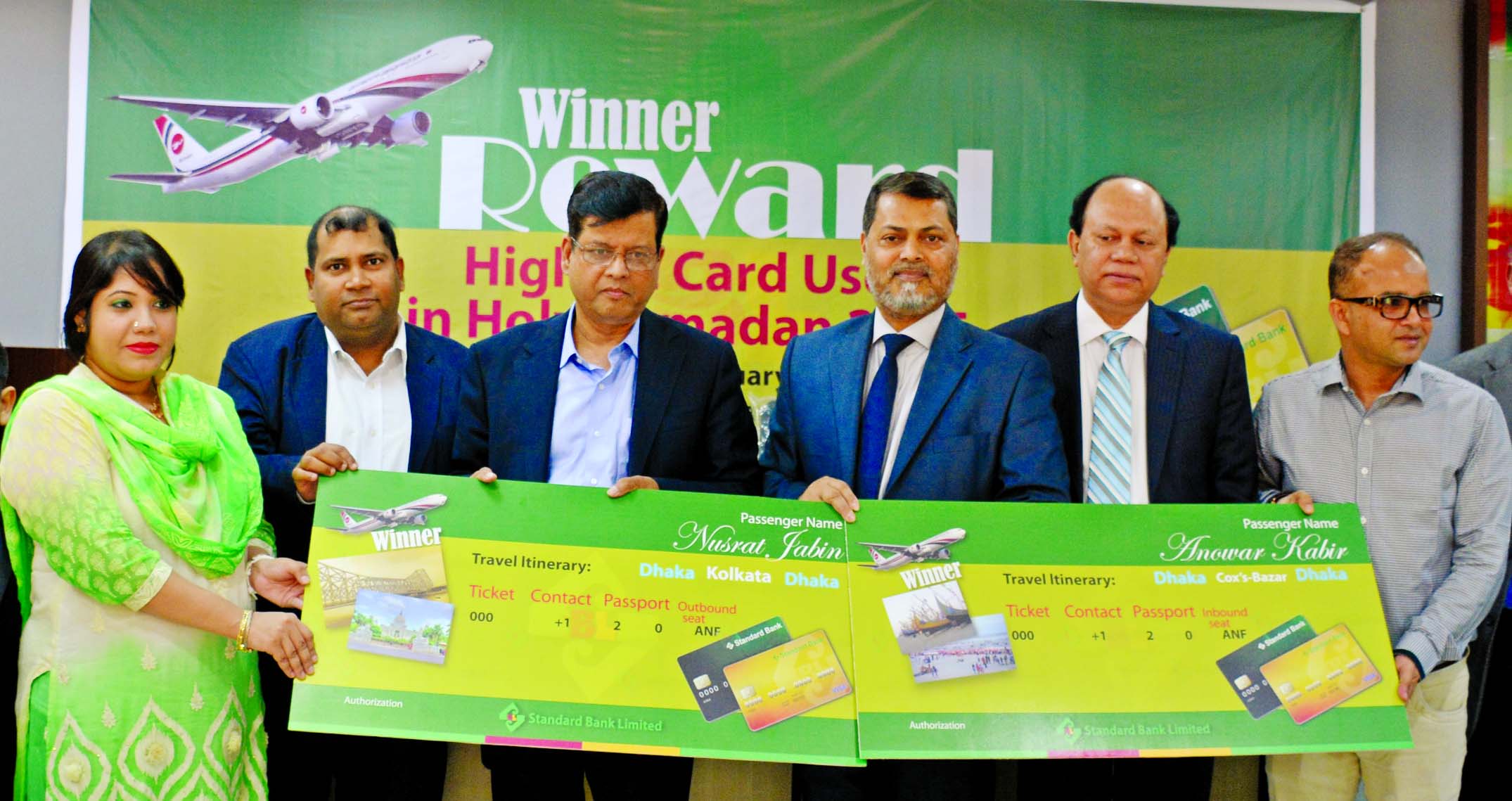 Md Nazmus Salehin, Managing Director of Standard Bank Limited, handing over air tickets to Nusrat Jabin and Anowar Kabir for highest transaction doers of SBL Credit Card under "Ramadan Transaction Campaign 2015" at the bank's head office recently. Additio