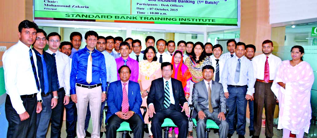 Md Nazmus Salehin, Managing Director of Standard Bank Limited poses with the participants of a 2-day long workshop on "Special Deposit Banking: School Banking and Inclusive Banking" at its Training Institute. Md Zakaria, Principal and Md Amzad Hossain Fak