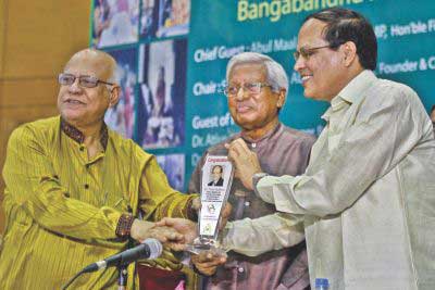 Finance Minister AMA Muhith gives a crest to Bangladesh Bank Governor Atiur Rahman on behalf of Credit and Development Forum at a conference on microfinance at Bangabandhu International Conference Centre in Dhaka yesterday. Sir Fazle Hasan Abed, chairperson of BRAC, is also seen.