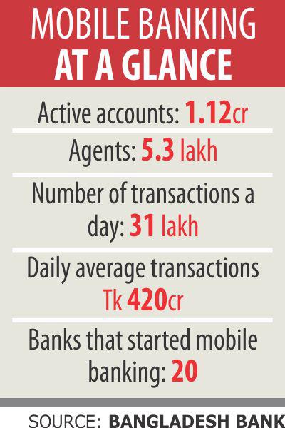 The central bank started providing mobile banking licences to banks in 2009. On average, Tk 420 crore is transacted a day through mobile banking with activities mostly limited to cash-in and cash-out and person-to-person transfers. Salary disbursement and utility payments through mobile phones have remained very negligible.