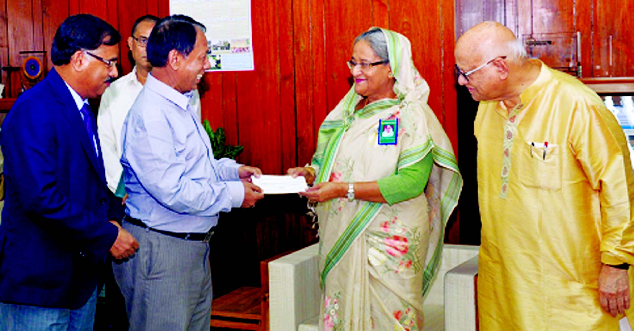 Monzur Hossain, Chairman and Md. Ataur Rahman Prodhan, Managing Director of Rupali Bank Limited, handing over a cheque to Prime Minister Sheikh Hasina for her Relief Fund on Monday. Finance Minister AMA Muhith was also present.