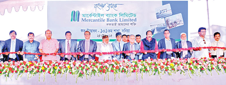 Morshed Alam, MP, Chairman of Mercantile Bank Limited, inaugurates the 101st branch of the bank at Donia in the capital on Monday. Alhaj Habibur Rahman Molla, MP, Syed Abu Hossain Babla, MP, Alhaj Akram Hussain (Humayun), Chairman of the Executive Committee of the bank, and other high officials were also present on the occasion.