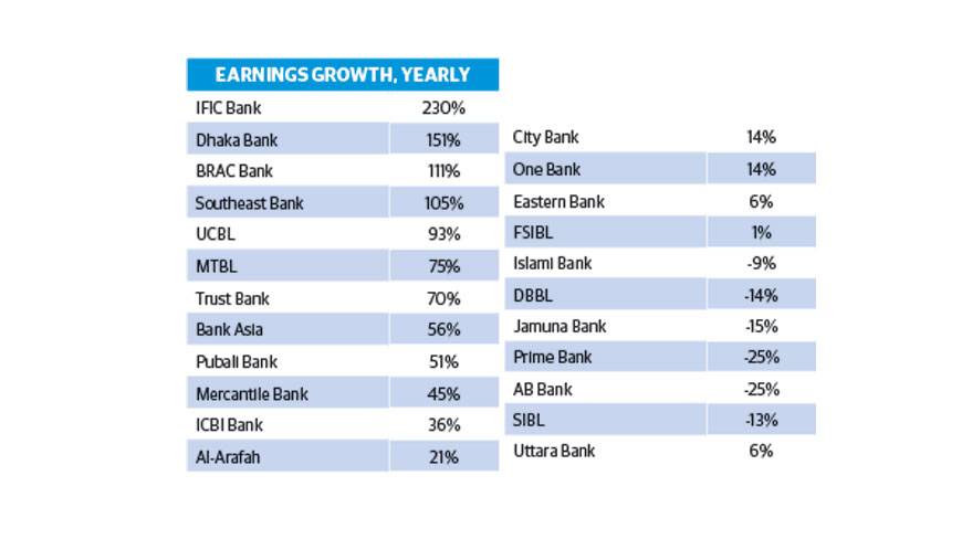 Profits of Dhaka Bank grew 151%, BRAC Bank 111% and Southeast Bank 105% during the period, according to the earnings per share disclosed on DSE website.