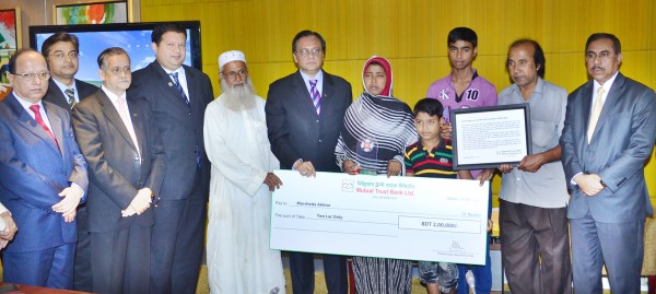 Mutual Trust Bank Ltd. (MTB) has taken responsibility for bearing all educational expenses up to HSC level for the two sons of late Liacot Ali, who lost his life while trying to save a young lady attacked by miscreants in Uttara, Dhaka on July 3, 2014, reports in a press release. Anis A. Khan, Managing Director & CEO of Mutual Trust Bank handed over a cheque of Taka Two Lacs, a certificate and a plaque to the widow of late Liacot Ali, Morsheda Akhter and her two sons, Morshedul Jannat and Mishkatul Mustakin Jim, at a simple ceremony held at the MTB Corporate Head Office in Gulshan, Dhaka on July 17, 2014. The bank also launched “MTB Bravery Awards” at the event, which has been introduced specially to honour people like Liacot Ali, and who show great courage with a spirit of self-sacrifice to save and protect the lives of other people put on peril. MTB Deputy Managing Directors, other senior officials and relatives of late Liacot Ali were also present at the occasion.