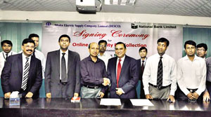 Managing Director & CEO of National Bank Limited Shamsul Huda Khan and Company Secretary of DESCO Engr. Zulfikar Tahmid, exchanging documents after signing an agreement on behalf of respective organisations in the city on Sunday. Under the agreement, clients of DESCO will now be able to pay their electricity bill through different branches of National Bank in Dhaka city.