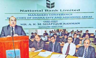AKM Shafiqur Rahman, Managing Director and CEO of National Bank Limited, speaks at a branch managers’ conference held at the bank’s training institute in Dhaka recently.