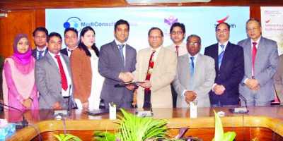 Md. Omar Faruque Bhuiyan, EVP and Head of cards of NCC Bank Ltd and Md Mostafizur Rahman, CEO, MediConsult associate of Singapore Health Services, exchange documents after signing a corporate agreement in Dhaka recently. Mohammed Nurul Amin, Managing Director of NCC Bank was also present on the occasion.