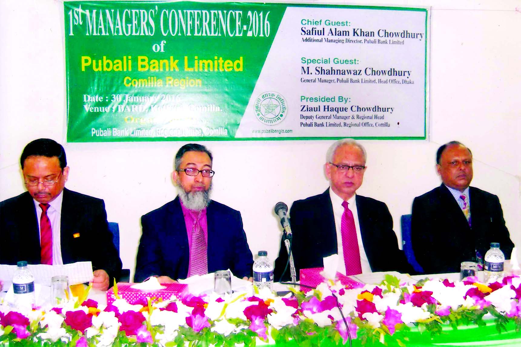 Economic Reporter :The 1st Managers' Conference- 2016 participated by all Managers of Comilla Region of Pubali Bank Limited held recently. Safiul Alam Khan Chowdhury, Additional Managing Director of Pubali Bank Ltd. was present as Chief Guest. M Shahnawaz Chowdhury, General Manager of Head Office was present as Special Guest. DGM and RM of Comilla Region Ziaul Haque Chowdhury presided over the conference.Safiul Alam Khan Chowdhury emphasized on expansion of foreign remittance business through better customer & modern banking service. He said, "The range of the economy of Bangladesh is increasing as world economy is doing the same. Banking sector is playing the lead role here. He urged all to work sincerely in this competitive banking sector. Mr. Chowdhury stressed on selection of potential borrower and try to enhance bank business. He also advised all to work hard, look for new business avenues and diversification and to take concerted efforts for achieving the target fixed for the year 2016. M Shahnawaz Chowdhury stressed on selection of potential borrower and try to expand bank business. He urged upon all the executives to keep close vigilance so that newly disbursed loans may not become overdue or classified. Intensive supervision and close monitoring of the loan should be made. At the conference, necessary strategies and plans were framed to achieve the target fixed for the year 2016. Branch Managers of Comilla Region were also attended at the conference.