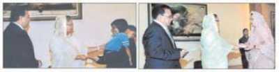 Prime Minister Sheikh Hasina handing over a cheque as part of yearly contribution provided by Mutual Trust Bank Ltd (MTBL) to two families affected by BDR carnage of 2009 at Gonobhaban recently.MTBL Chairman Dr Arif Dowla was present on the occasion. The Prime Minister also handing over another cheque worth Tk 4,80,000/- for fourth year to two families of the martyred army officers in the Pilkhana mutiny with the financial support of Shahjalal Islami Bank Limited (SJIBL).Chairman of SJIBL Anwer Hossain Khan was also present, among others.